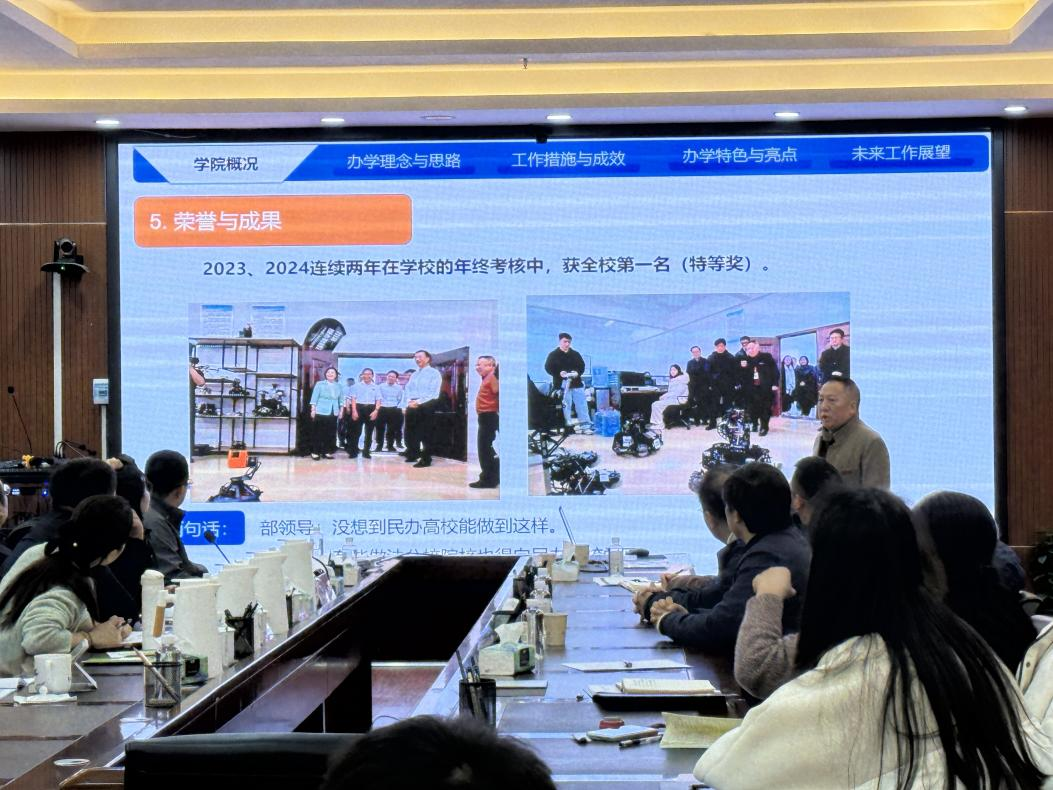 专家组在听取汇报后,对学院清晰的办学定位、扎实的产教融合举措及“让学生出彩”的育人成效给予高度评价,认为学院办学思路清晰、特色鲜明,做法“有营养、有亮点”,部分经验值得公办院校借鉴。同时,专家组围绕汇报结构优化、专业与产业对接显性化、学生管理服务展示及课程体系与教学成果提炼等方面,提出了针对性宝贵建议。
