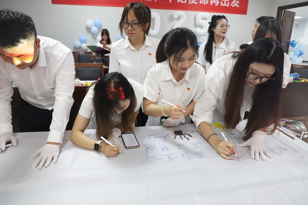 毕业生党员积极参与互动环节,在画布书写寄语、按下手印,表达对母校的眷恋与对未来的期许。他们折叠写满祝福的纸飞机与千纸鹤,将其拼贴成“展翅翱翔”造型,寓意以梦为马、不负韶华,在新时代征程中勇毅前行。