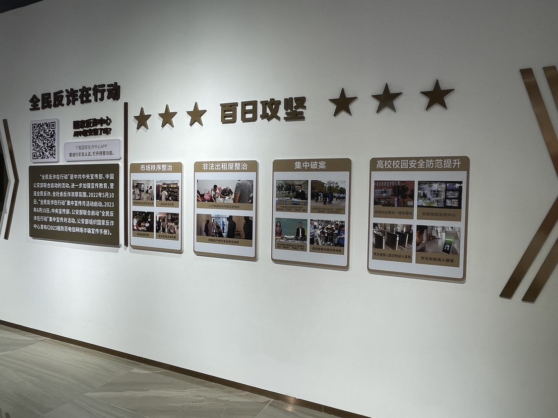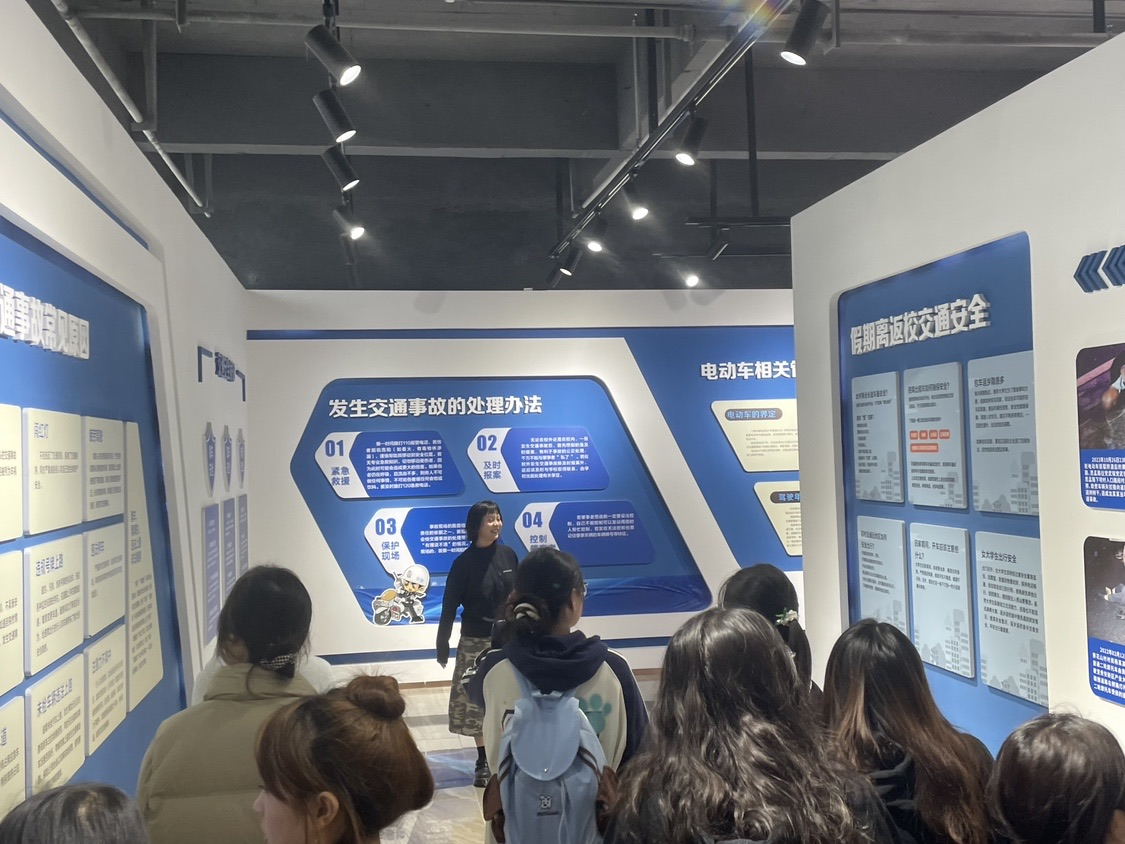 走进基地A区,学习小组成员首先通过图文展板与影像资料,系统了解花溪大学城的发展历程与各级领导的关怀支持。随后,围绕反诈、扫黑除恶、交通安全及消防科普等核心内容,大家在讲解员的带领下,结合真实案例剖析与模拟场景体验,深入学习风险识别方法与应急处置技巧。从“电信诈骗话术拆解”到“火灾逃生路线模拟”,每一个环节都让成员们直观感受到安全防护的重要性,进一步提升了自身法治素养与风险防范能力。