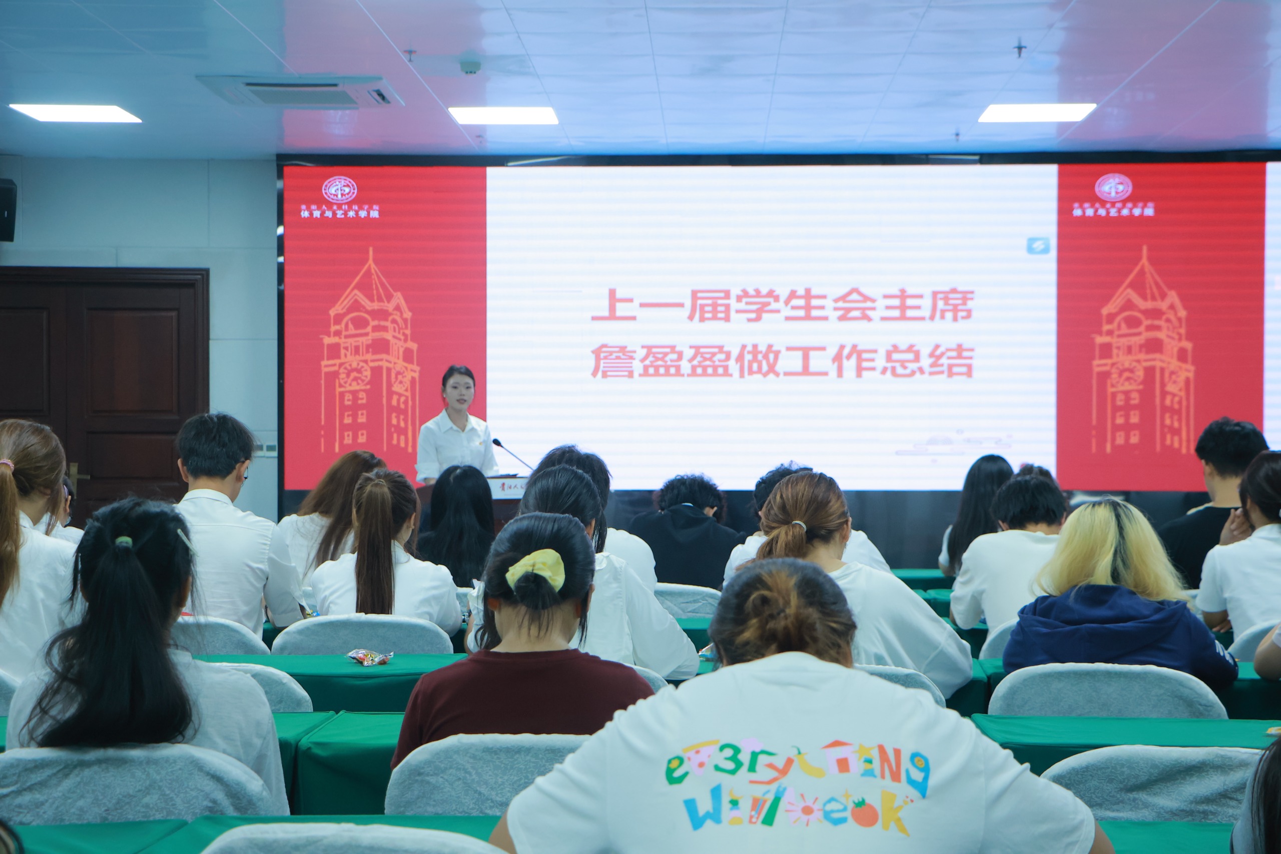 紧接着,上一届学生会主席团成员詹盈盈围绕上一学年学生会工作进行详细汇报。她以日常管理规范化、活动组织品牌化、学生服务精细化为核心主线,系统总结学生会在服务同学成长、助力学院发展过程中取得的具体成效,全方位展现了上一届学生组织的责任担当与实干精神。