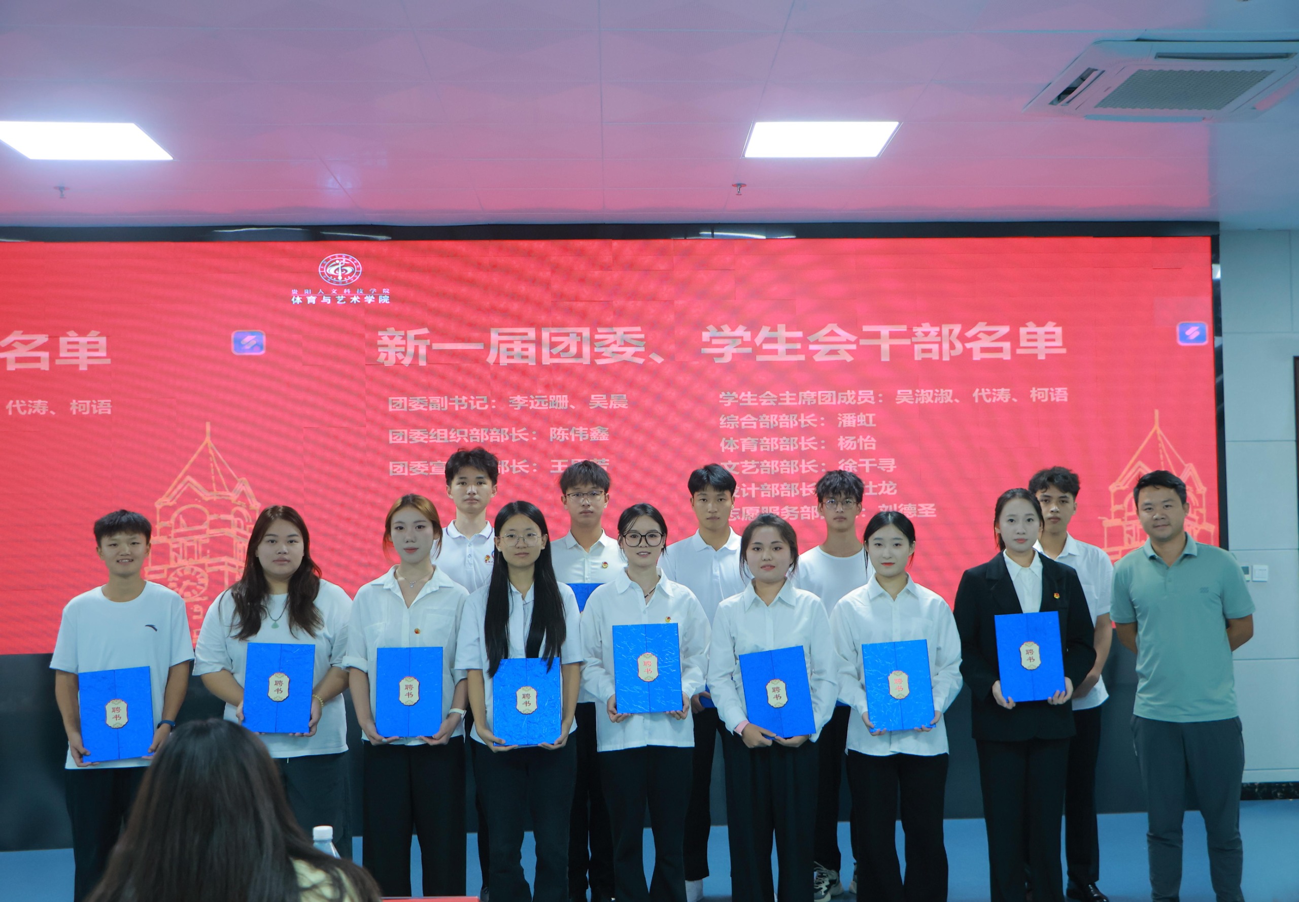 表彰过后,大会进入核心的换届环节。团委书记张鸿雁宣读现任团委、学生会学生干部名单,新一批学生骨干的名单正式揭晓。学院党委副书记邓程民亲自为新任干部逐一颁发聘书,每一份聘书既是对新任骨干能力的认可,更是一份沉甸甸的责任,见证着新一届学生骨干正式接过 “接力棒”,开启履职新征程。
