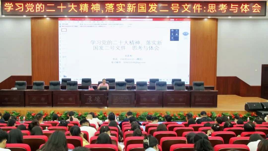 2023年6月16日下午,民建中央经济委员会副主任、民建贵州省委副主委、贵州省社会科学院研究员、省管专家刘庆和应邀为pp电子师生作“学习党的二十大精神,落实新国发二号文件:思考与体会”专题讲座。讲座由学校党委副书记马帅主持。