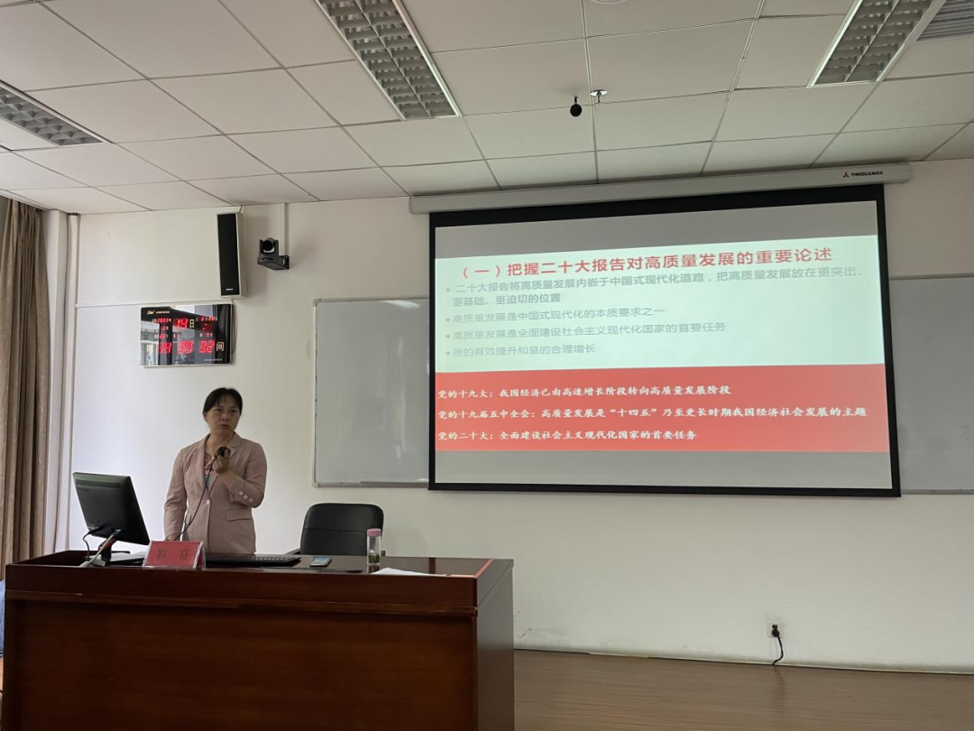 郭蓓副教授紧紧围绕准确把握高质量发展、新发展格局的内涵和关系、加快构建新发展格局,着力推动高质量发展的重大意义、加快构建新发展格局,着力推动高质量发展的五大战略举措、贯彻二十大报告精神,着力推动贵州经济高质量发展四个方面,梳理了二十大报告对高质量发展的重要论述,阐释了什么是高质量发展、什么是新发展格局,总结出构建新发展格局、着力推动高质量发展的思路与举措。