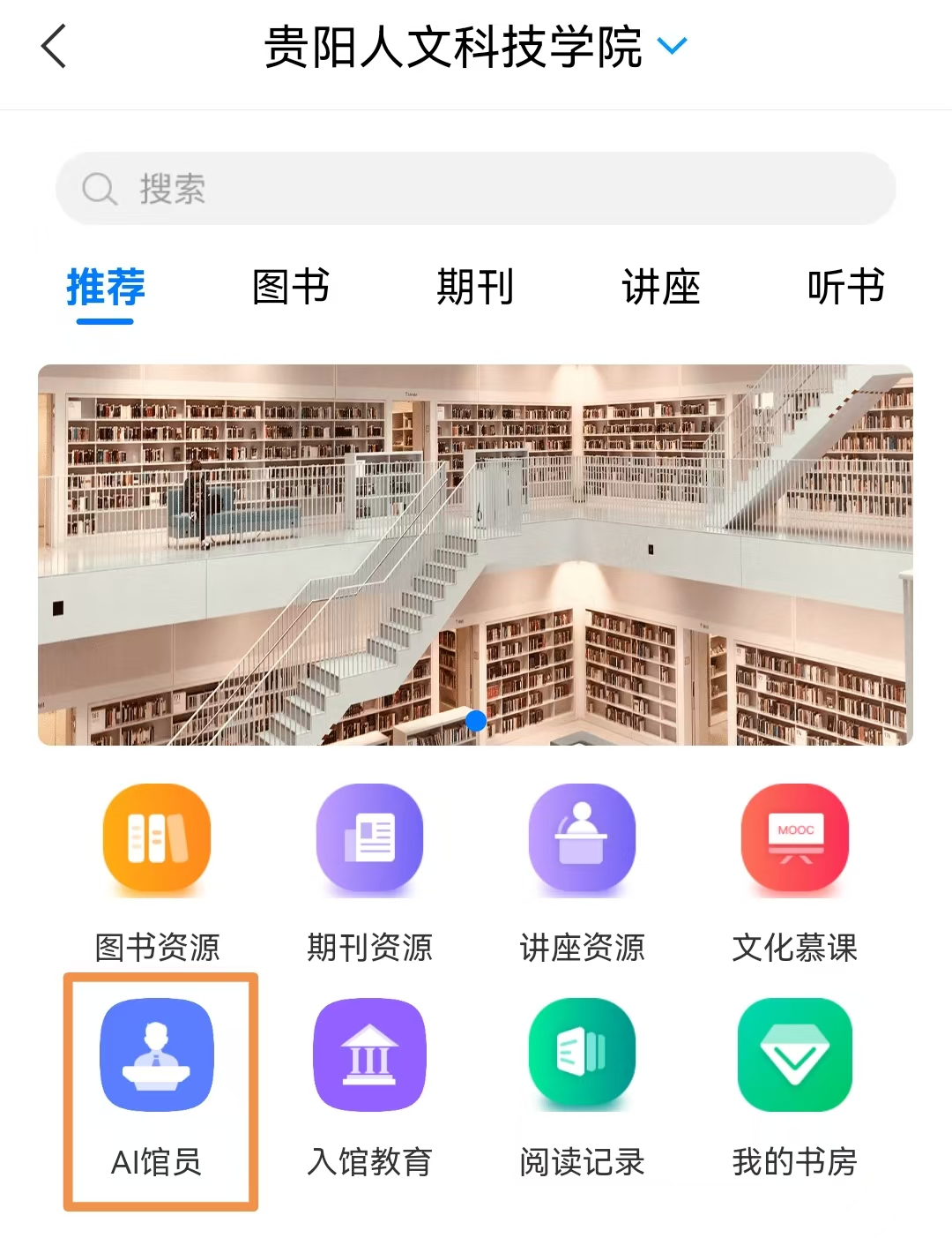 三、在图书馆资源操作界面中点击“AI馆员”,进入内测界面,即可开始测试流程。