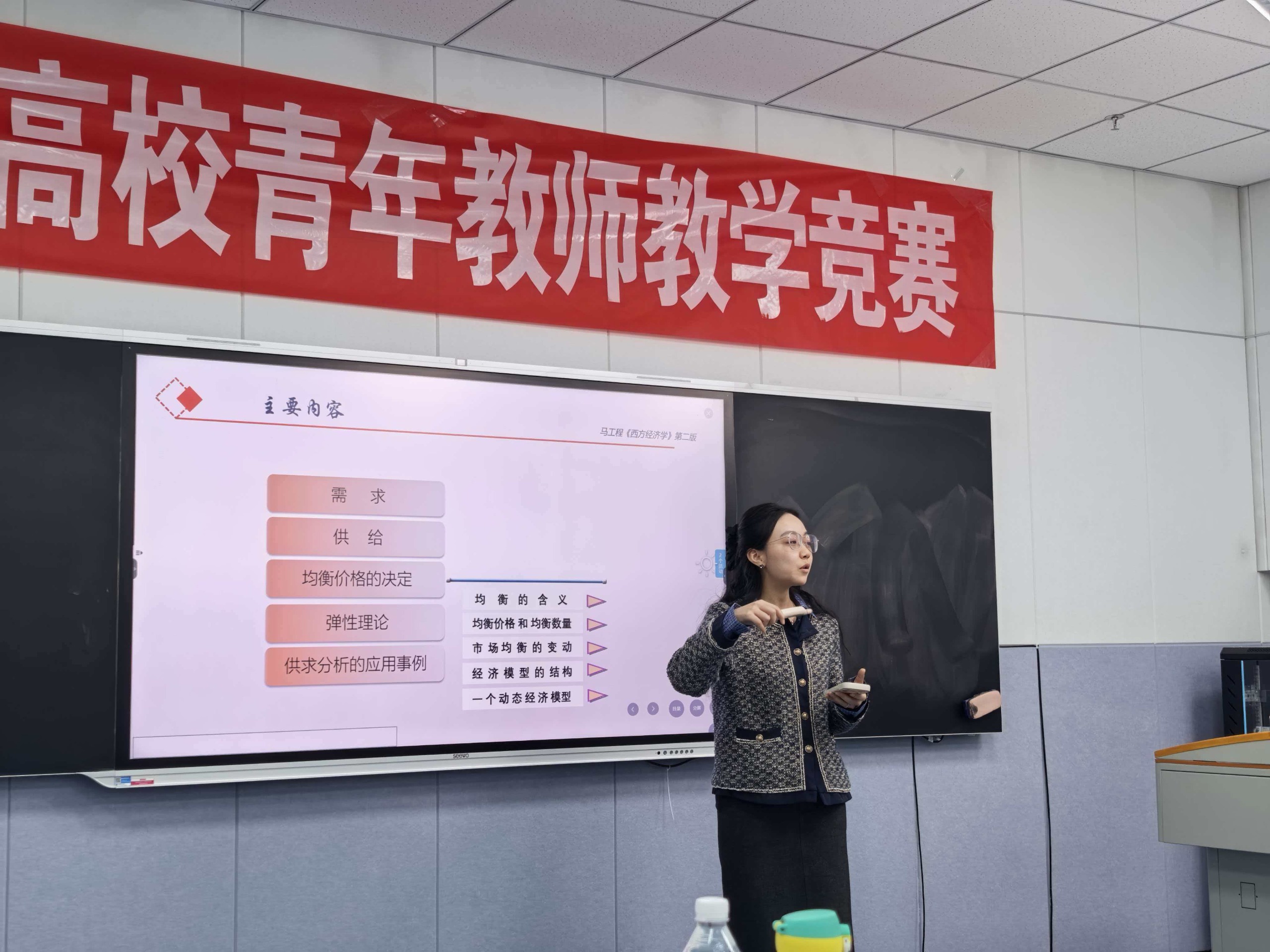 比赛现场,来自数字经济教研室、财管房开教研室、人力资源管理教研室、电子商务教研室、行政管理教研室、市场营销教研室6位选手按抽签顺序先后登台展示。她们紧扣学科前沿与社会经济发展需求,精心设计教学内容。在规定的20分钟个人课堂展示环节中,通过生动的语言、多样的教学手段与现代化的教育技术,将复杂的专业知识转化为易于理解的课堂讲授,充分展现了我院青年教师扎实的专业功底、创新的教学思维与饱满的教学热情。