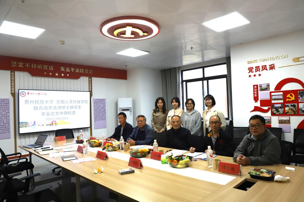 2025年10月20日下午,贵州民族大学与pp电子官方网站联合培养2023级法律硕士研究生学位论文中期检查在pp电子官方网站大学城校区师德楼610会议室举行。组长由贵州省社科院原党委书记、二级教授、博士生导师吴大华担任,专家组成员有贵州大学教授、博士生导师余贵忠,pp电子官方网站法学院教授廖志刚,pp电子官方网站法学院教授刘晓海,pp电子官方网站法学院副教授李毅。法学院院长杨武松、副院长倪亭、秘书刘凌云、联合培养2023级法律硕士研究生参加会议。
