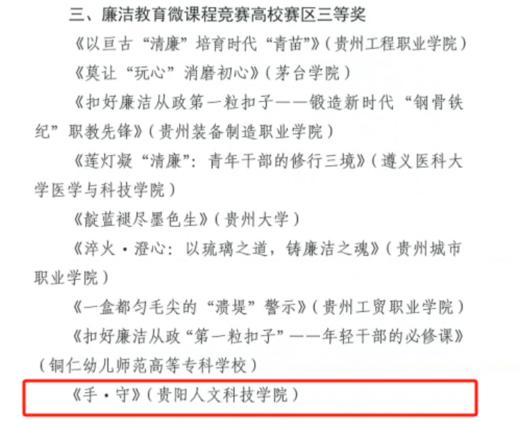 近日,省委教育工委公布了2025年贵州省年轻干部廉洁教育微课程竞赛高校赛区获奖名单,pp电子体育与艺术学院刘璐、张鸿雁、支胜杰三位教师组成的团队精心创作,拍摄的微课程作品《手·守》荣获高校赛区三等奖