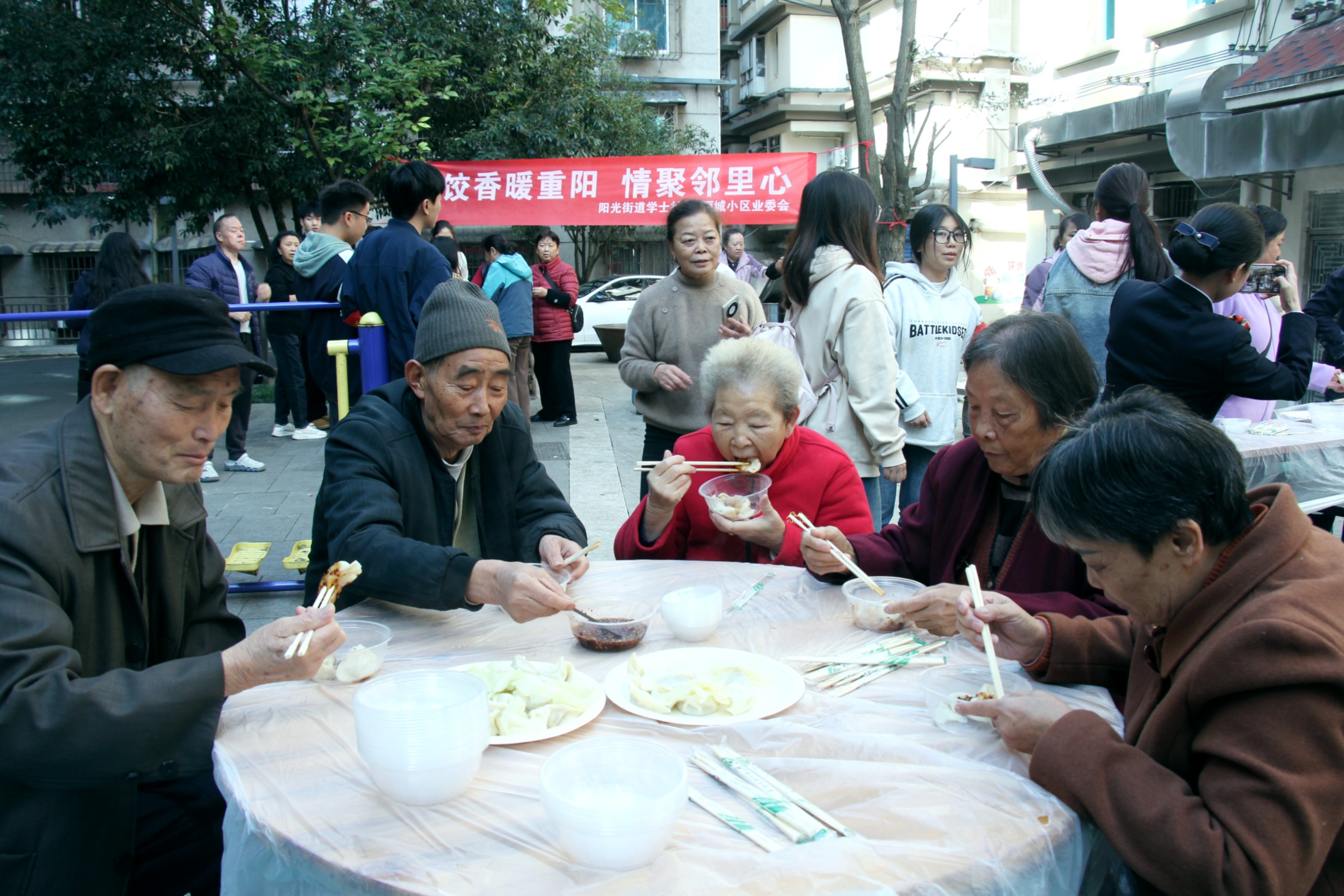 热气腾腾的饺子出锅后,一部分被迅速端至就餐区,供老人与志愿者现场共享;就餐区里,师生与老人围坐在一起,品尝亲手包制的饺子,畅谈生活点滴,暖意与香气在空气中交织,构成一幅温馨和谐的画面。针对社区内行动不便的老人,学院组建专项配送小组,按照提前整理的老人清单上门送饺子。每到一户,志愿者都主动送上节日问候,耐心询问老人的身体状况与生活需求,用贴心服务为无法到场的老人送去节日温暖,让他们切实感受到高校青年的关爱与社会大家庭的温暖。、