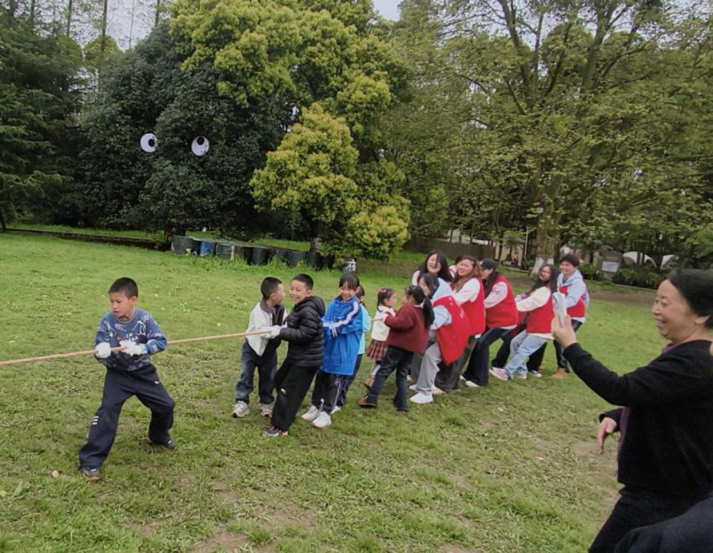 趣味体育环节中,志愿者们组织社区小朋友开展拔河比赛,将现场氛围推向高潮。赛场上,孩子们凝心聚力、奋勇争先,紧握长绳、奋力拼搏,稚嫩的脸庞上满是坚韧与朝气,每一次发力、每一声呐喊,都彰显着少年儿童的蓬勃活力,赢得现场家长们的阵阵喝彩与一致赞誉。随后,志愿者们带领孩子们跳起欢快的“兔子舞”,欢声笑语回荡在草坪之上,让孩子们在运动中释放活力,在陪伴中收获快乐。