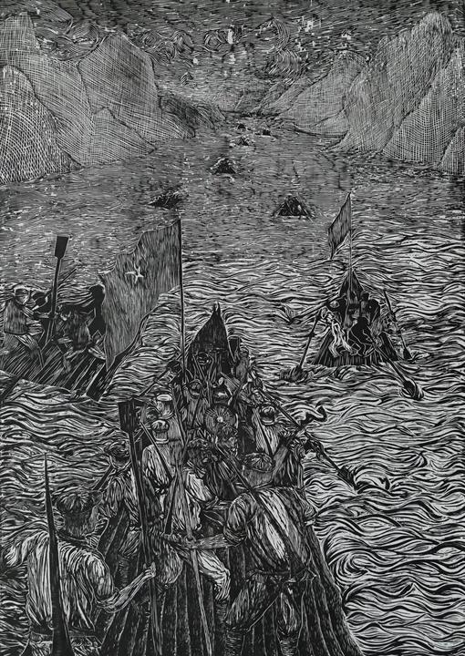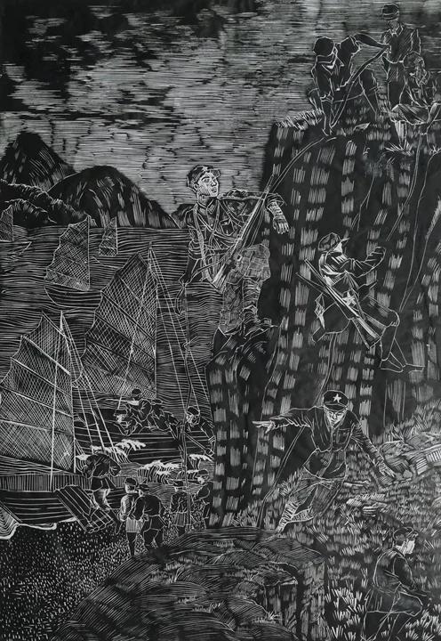 在学生绘画组中,魏琴同学的版画作品《前进!前进!》、王光荣同学的版画作品《竹筏破黔江》荣获三等奖。