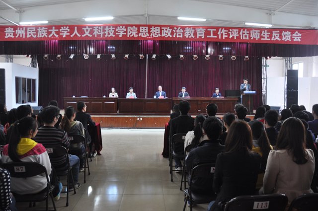 10月26日下午,省教育厅思想政治教育工作评估专家组分别在我院第三会议室和多功能展厅举行了思想政治教育工作评估反馈会。省教育厅思想政治教育工作评估专家组副组长、贵州工业职业技术学院党委书记张义明,省教育厅民办教育处处长宋黔萍,贵州师范学院马列部主任刘红,贵州广播电视大学宣传部部长张仁俊,贵州民族大学副校长肖远平,人文科技学院党委书记韦建平、党委副书记陆官虎、副院长谭振亭、吴汝善、黄玮出席了本次会议。