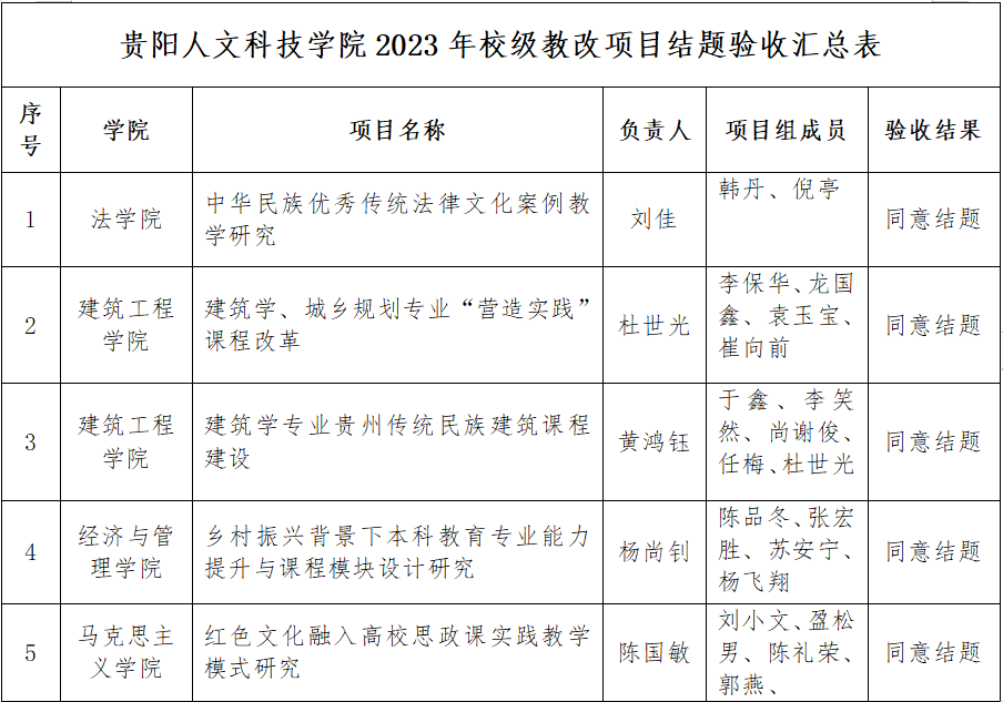 根据人文教字2023【42】《关于开展2023年省级、校级教学内容和课程体系改革项目结题验收的通知》要求,教务处组织专家对2021年立项的校级教改项目以及2020年延期结题的教改项目进行了结题验收。经验收审查,同意以下项目结题,现予公示,公示期为2023年9月26日至10月3日(共7天)。如对评审结果有异议,请在公示期内向教务处反映。