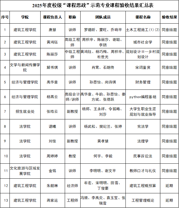 根据人文教字2025【40】《关于开展2025年度校级“课程思政”示范专业课程结题验收的通知》要求,教务处组织专家对按期结题项目进行验收。经专家评审、学校领导审定,拟同意以下11门课程结题、13门课程延期、1门课程撤项(详情见下表)。现予公示,公示期为2025年11月13日至2025年11月17日(共3个工作日)。如对评审结果有异议,请在公示期内向教务处反映。