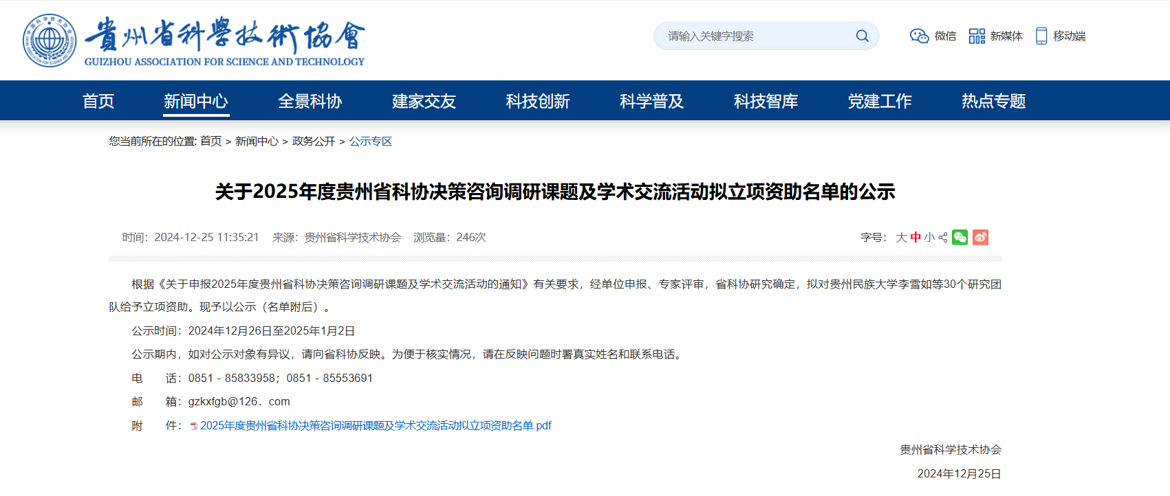 近日,贵州贵州省科学技术协会公布了《关于2025年度贵州省科协决策咨询调研课题及学术交流活动拟立项资助名单的公示》,pp电子杨晓老师申报的青年课题《智慧康养:贵州省康养产业科技赋能路径与策略研究》、杨尚钊老师申报的青年课题《返乡创(就)业青年对乡村社会公共服务设施需求研究》喜获立项。