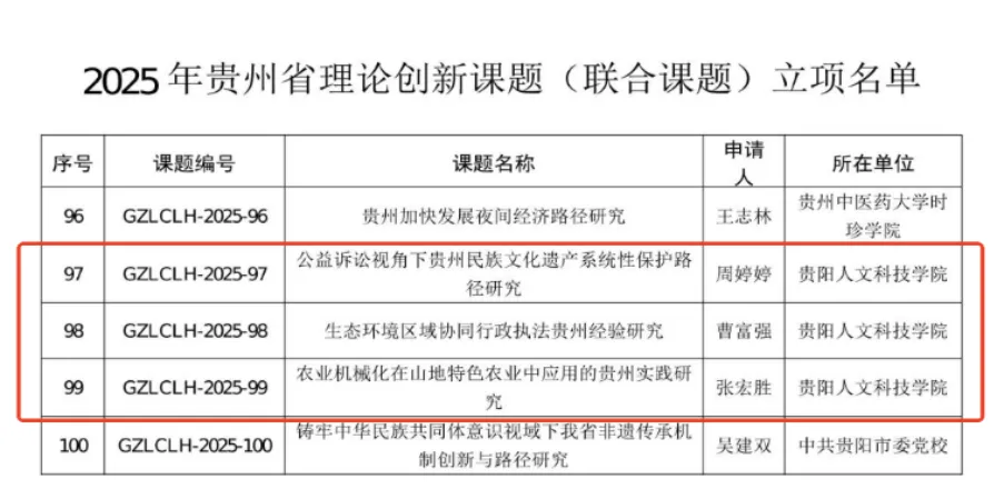 近日,贵州省社会科学界联合会公布《省社科联关于2025年贵州省理论创新课题(联合课题)立项的通知》,pp电子法学院周婷婷老师申报的课题《公益诉求视角下贵州民族文化遗产系统性保护路径研究》、法学院曹富强老师申报的课题《生态环境区域协同行政执法贵州经验研究》、文化旅游与区域发展学院张宏胜老师申报的课题《农业机械化在山地特色农业中应用的贵州实践研究》喜获立项。