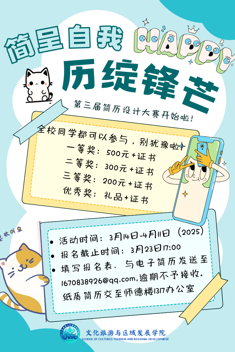 注:简历内容须积极向上,紧扣时代主题,更多内容请关注文化旅游与区域发展学院公众号。