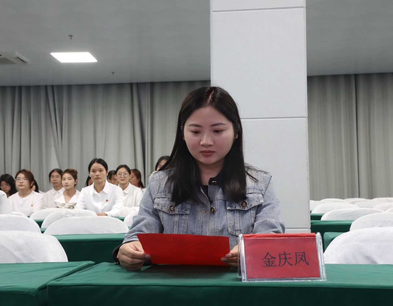 紧接着,在金庆凤老师的带领下,全体新团员面向团旗立正,以洪亮而坚定的声音庄严宣誓:“我志愿加入中国共产主义青年团,坚决拥护中国共产党的领导,遵守团的章程,执行团的决议,履行团员义务,严守团的纪律,勤奋学习,积极工作,吃苦在前,享受在后,为共产主义事业而奋斗。” 铮铮誓言在会议室回荡,彰显着新团员们为共产主义事业奋斗的决心。