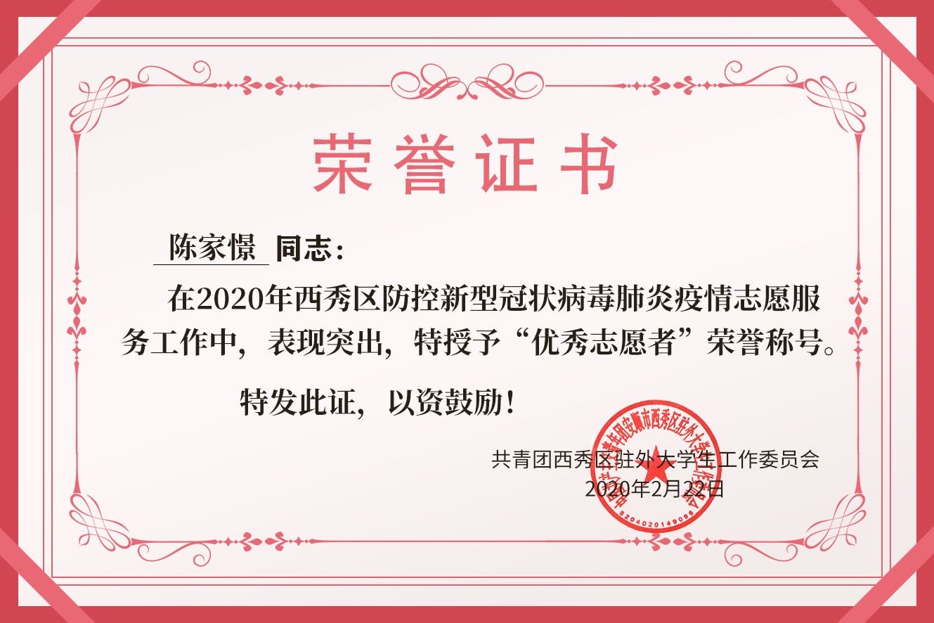 陈家憬,女,共青团员,经济与管理学院2018级旅游管理专业3班学生。2020年2月16日至24日,她参加了安顺市西秀区防控新型冠状病毒肺炎疫情志愿者工作,她主要是帮助社区工作人员张贴宣传资料,在卡点登记小区进出人员的信息,同时,为人们宣传疫情防控知识,提醒大家注意加强自我防护等。她在志愿服务期间,对工作认真负责,有耐心,并得到了领导和当地居民的肯定,获得了2020年西秀区防控新型冠状病毒肺炎疫情志愿服务“优秀志愿者”荣誉称号。