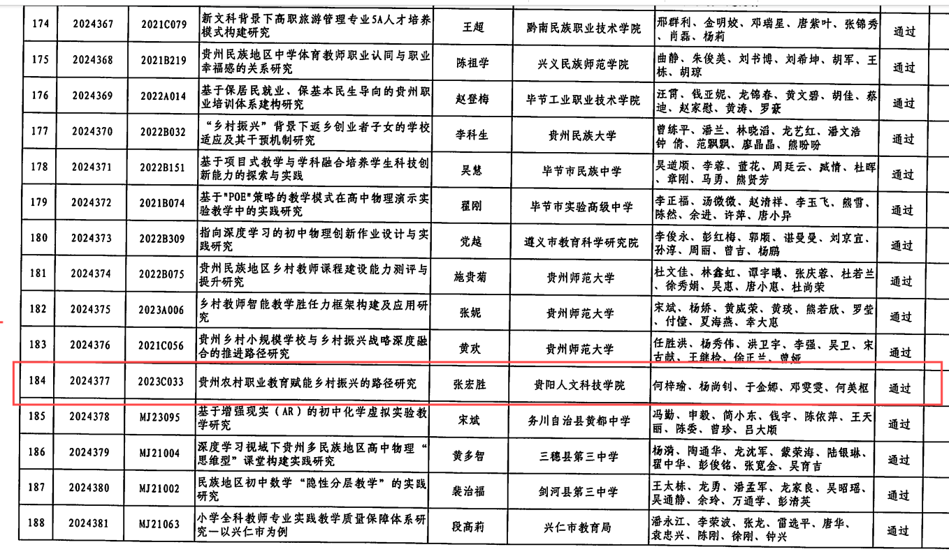 近期,贵州省教育科学规划领导小组办公室正式公布2024下半年贵州省教育科学规划课题结题审核结果的公告。pp电子张宏胜老师主持的课题《贵州农村职业教育赋能乡村振兴的路径研究》,以高质量的研究成果顺利通过结题验收。