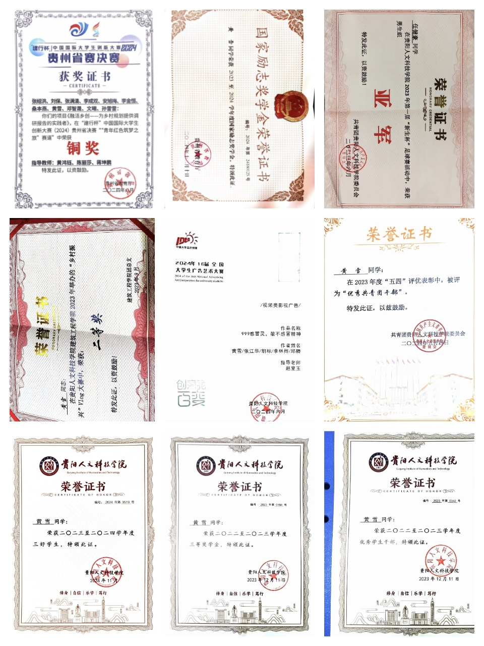 该生专业学习态度严谨求实,连续两年综合成绩稳居专业前茅,绩点位列前5%。凭借扎实的理论基础,于2023年获校级三等奖学金,2024年荣获国家励志奖学金。同时,注重知识转化应用,在学科竞赛中表现突出:2024年6月,其主创的广告策划案获全国大学生广告艺术大赛校级三等奖;同年7月,参与“建行杯”中国国际大学生创新大赛项目,团队协作荣获省级铜奖,实现学院在该赛事的新突破。