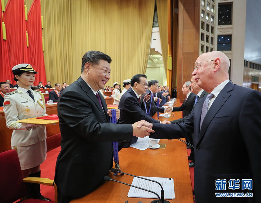 在《春天的故事》乐曲声中,习近平等为获得改革先锋称号、中国改革友谊奖章人员代表颁奖。