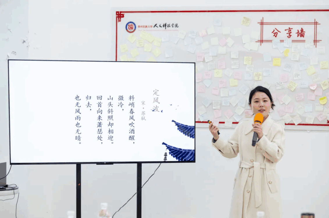 朗诵的余韵尚未消散,中文教研室的解书琪老师便带来了对苏轼词作的精彩解读,同时将苏轼被贬黄州时期的生活经历娓娓道来。从苏轼在黄州的艰苦生活,到他在困境中坚守内心、创作出众多流传千古的佳作,解老师的分享,让大家对苏轼有了更全面、更深刻的认识,也更加理解了他的作品为何能跨越千年,依然在文学史上熠熠生辉。