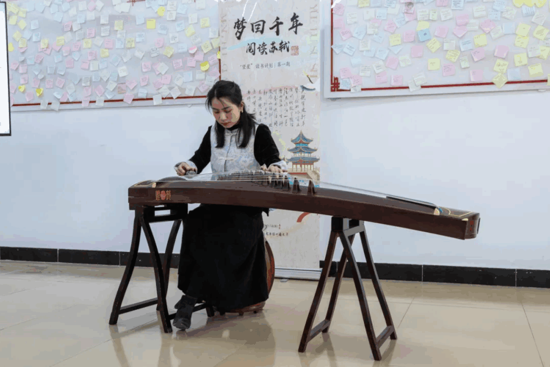 交流过后,体育与艺术学院陈春娥老师带来古筝曲《定风波》(片段)的精彩演奏。悠扬的古筝声与苏轼的词完美融合,让师生们在音乐中再次领略到苏轼的豁达超脱,为本次活动增添了别样的艺术氛围。