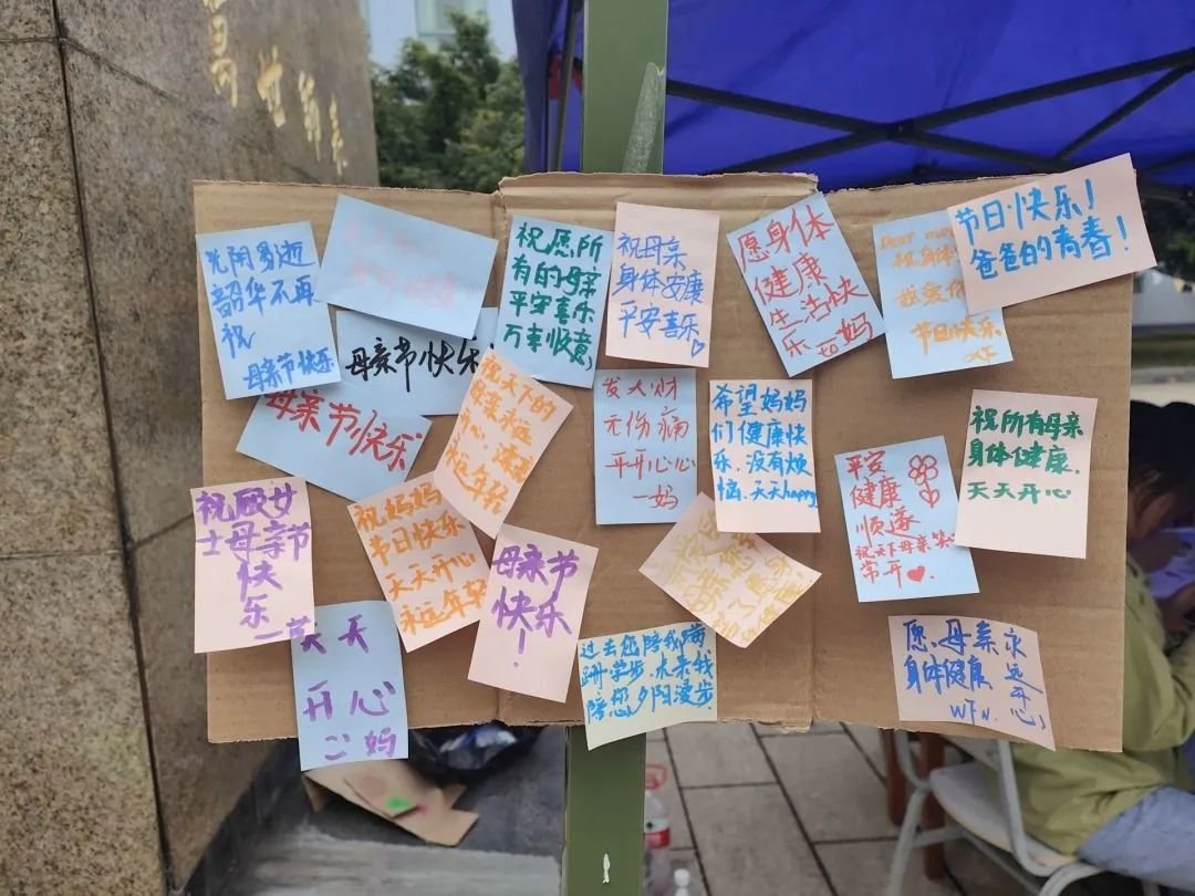 1.利用废弃纸壳做展板,让社团成员以及来往的同学在便利贴上写下对母亲的祝愿,亲手粘贴在展板上,让更多的人看到。
