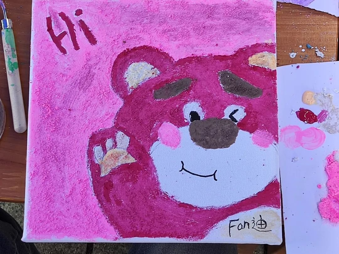 3.发挥自己的想象创作能力,用铅笔勾勒出大致图形,然后将石英砂与颜料完美结合,现场创作肌理画,并与自己的作品合影留念。
