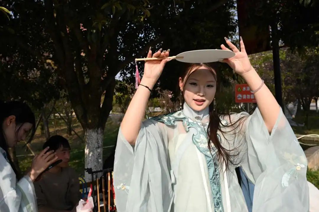 数位同袍广袖飘飘,在树下复原"曲水流觞",那是独属于汉服的风采。
