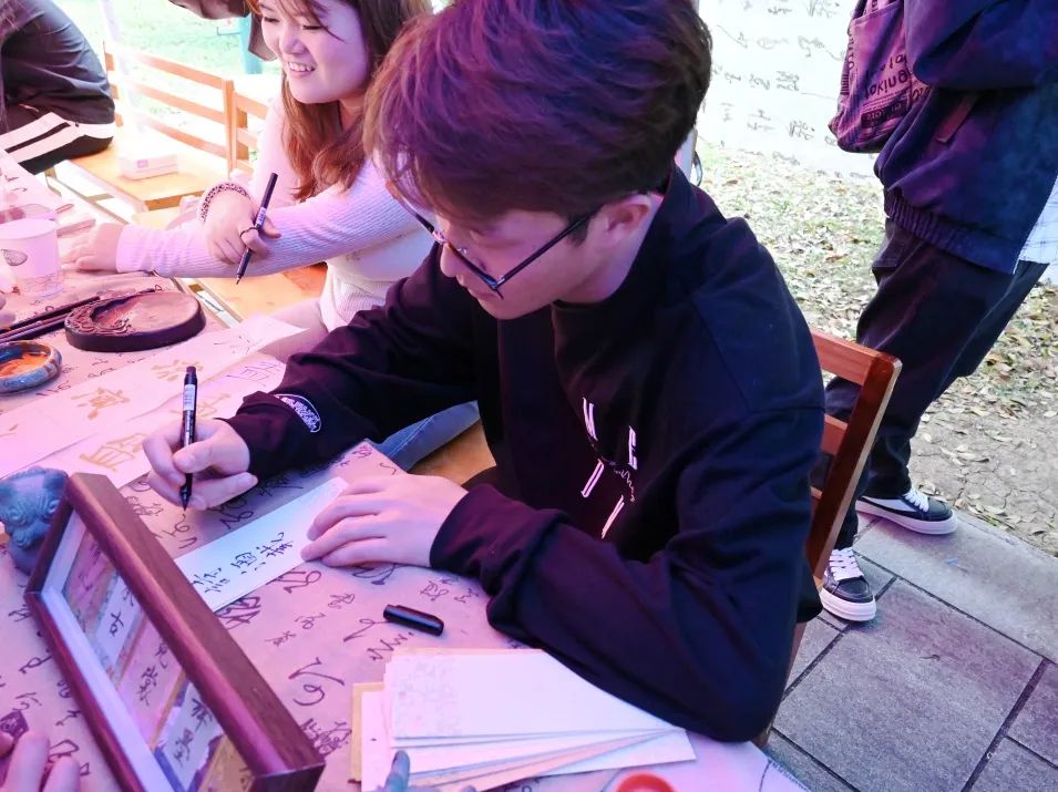 趣味互动区人气爆棚!投壶游戏区欢声不断,参与者手持箭矢,瞄准壶口,体验古人宴饮之乐;书法接龙区更是排起长队,同学们争相挑战,用笔尖续写诗意篇章。