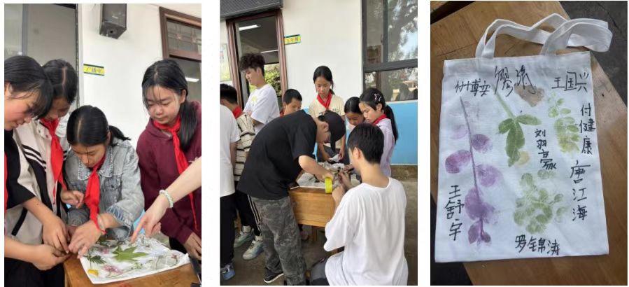在枫香树的浓荫之下,第三小组的植物拓染体验课程正如火如荼地展开。大学生们正引导着五、六年级的学生们采集樟树叶和野菊花,将它们仔细地排列在帆布袋上,然后用木槌耐心地敲打,以完成拓染。随着锤子落下,叶片的脉络清晰地显现出来,形成了独特的自然印记。六年级的李梦婷同学将拓染完成的布料设计成了环保袋,并兴奋地说:“我要把它送给妈妈,上面有她喜欢的枫叶和小雏菊!”这次活动生动地展示了孩子们对自然的细致观察以及他们的创意巧思。