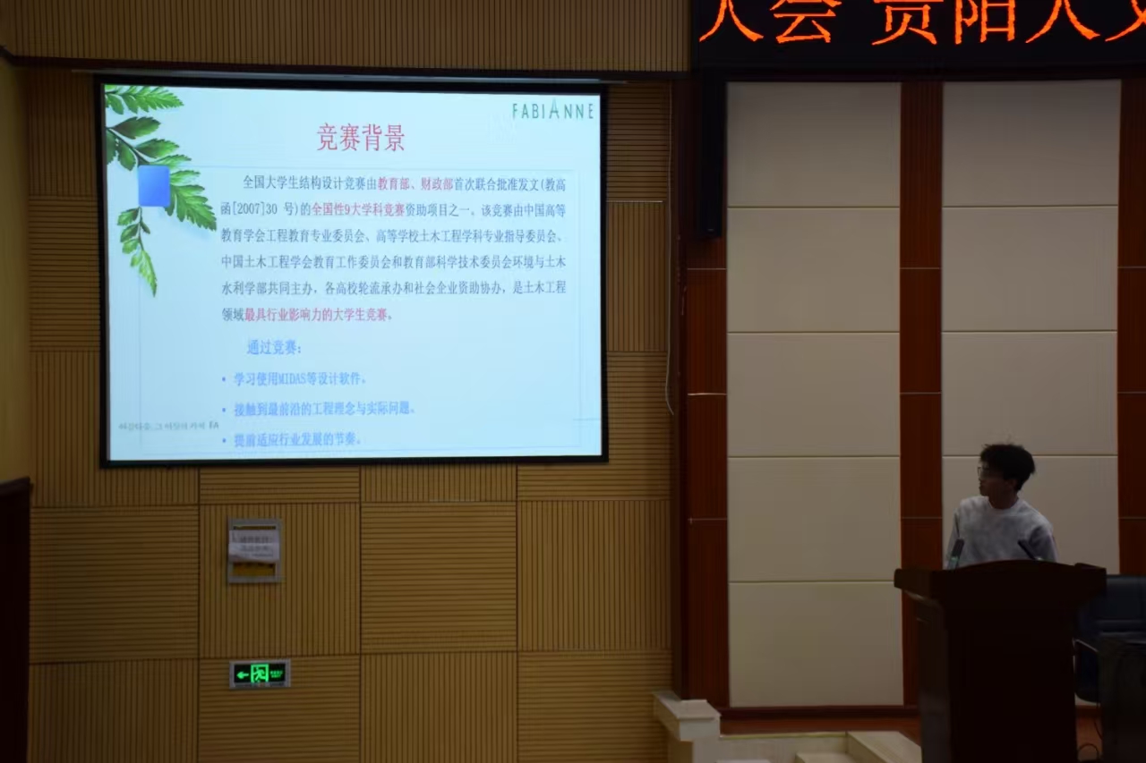 土木工程协会副会长任建豪对历年赛题进行了简要概述,分享了pp电子历年来的参赛历程、经验累积以及今年的赛事安排和报名流程。今年的赛题要求参赛者制作一艘由船体结构、船篷结构以及必需的非结构部件组成的乌篷船模型。他激励同学们积极参与比赛,并欢迎大家加入新成立的土木工程协会。