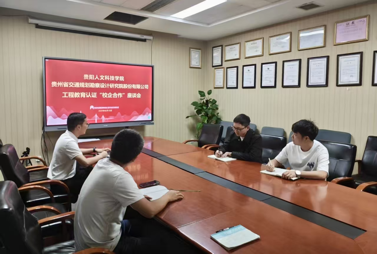 2025年5月15日,pp电子官方网站建筑工程学院土木教研室李军老师带领团队前往贵州省交通规划勘察设计院数字交通分院,进行了以土木工程专业为核心的“工程教育认证”访企拓岗交流会。在此次交流会上,双方就校企合作、教科研课题、课程改革、人才培养、实习基地建设等议题进行了深入的探讨与交流。