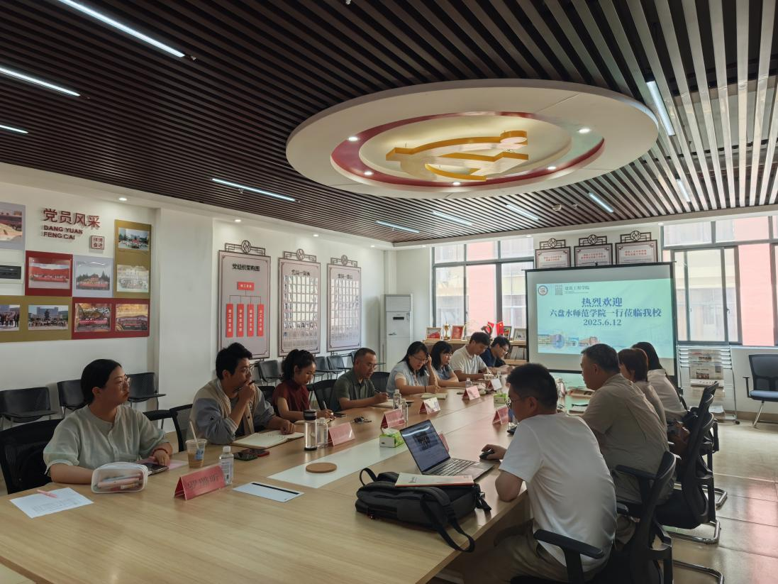 6 月 12 日,六盘水师范学院土木与规划学院副院长肖波率土木系主任马腾飞、风景园林系主任肖婵、城乡规划专业教师杨心桦一行到访我院,开展交流活动。学院院长黄宗胜、副院长黄鸿钰及各教研室主任热情接待,双方围绕建筑教育领域的多个关键议题展开深入研讨。