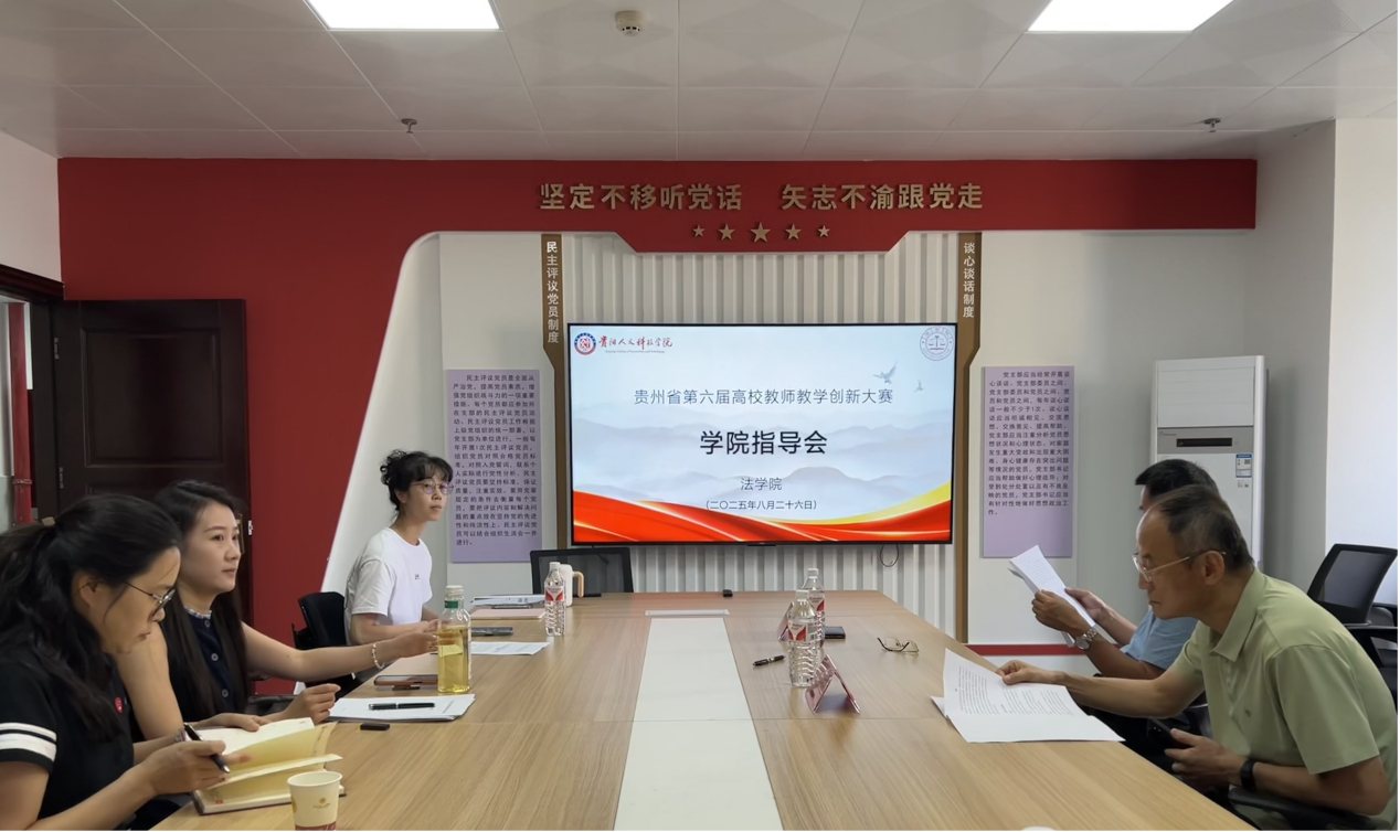 为进一步提高青年教师教学能力,更好备战贵州省第六届高校教师教学创新大赛,2025年8月26日下午,pp电子官方网站法学院专题召开教师教学创新比赛院内专家指导会。邀请廖志刚教授、刘晓海教授、余贵忠教授进行指导,法学院院长杨武松、副院长倪亭、教研室主任吴娅参会。