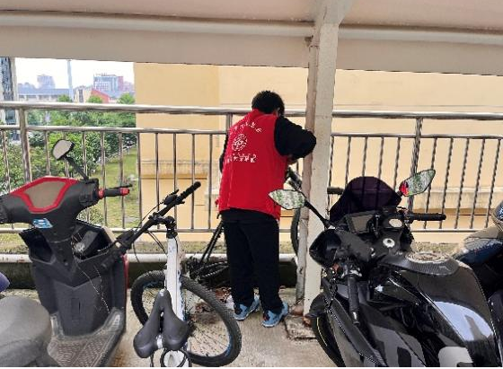 活动中,大家前往大学城校区师德楼和四栋宿舍停车区域,分别对两个区域的电动车、自行车、摩托车按照“入位、顺向、整齐”的要求进行规范摆放,并及时联系学校保卫处对废旧车辆进行整理。整理结束后,大家在四栋宿舍门口悬挂“车辆有序停放,你我出行通畅,共创文明校园”宣传横幅,提醒学校师生有序停放车辆,增强大家规范停车、维护校园整洁的意识与责任感。