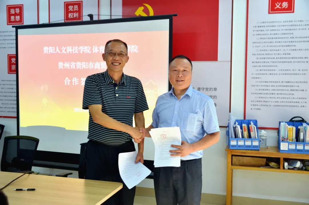 2021年9月15日16:00,体育与艺术学院与贵阳市商贸学校于学校科研楼301会议室举行合作签约仪式。体育与艺术学院党总支书记王雪、院长雷帮齐、贵阳市商贸学校执行校长杨敢、副校长李继林等出席了此次合作签约仪式,仪式由我院党总支副书记田丹主持。