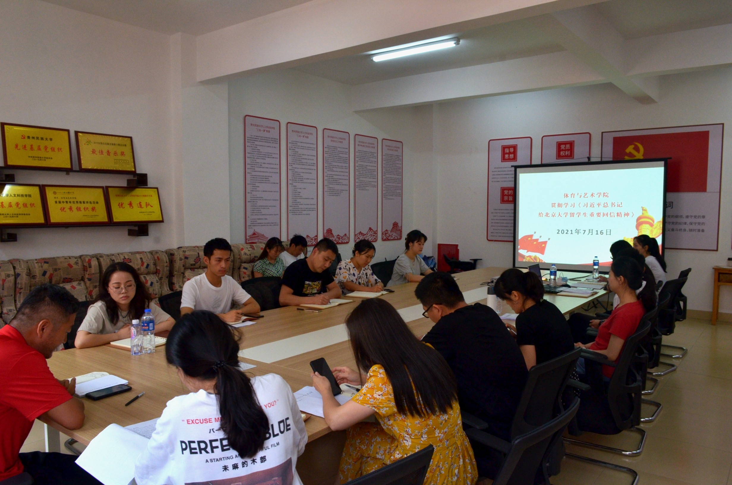2021年7月16日,体育与艺术学院全体教职工于科研楼301会议室集中学习《习近平总书记给北京大学留学生重要回信精神》,会议由体育与艺术学院党总支书记王雪主持。