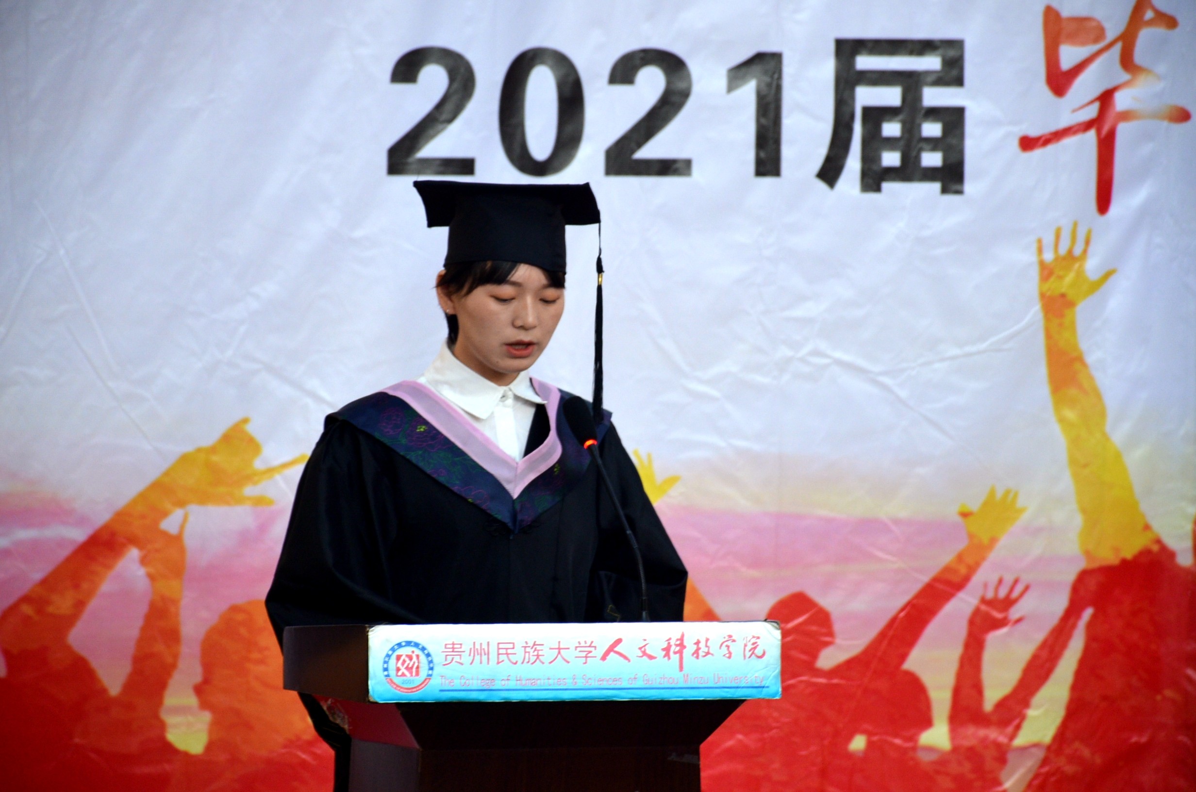仪式上,2017级环境设计专业学生熊昌娟首先代表2021届毕业生发言。她说到:“丰富多彩的大学校园就像是一个熔炉,煅烧出各自安好,与众不同的精彩人生。毕业是一首久唱不衰的老歌,是散场之后的余音绕耳,所有甜美或者苦涩的故事,都定格为热泪盈眶的欣悦。让我们牢记修身、自信、乐学、笃行的校训,努力开创我们各自更加美好的未来”。