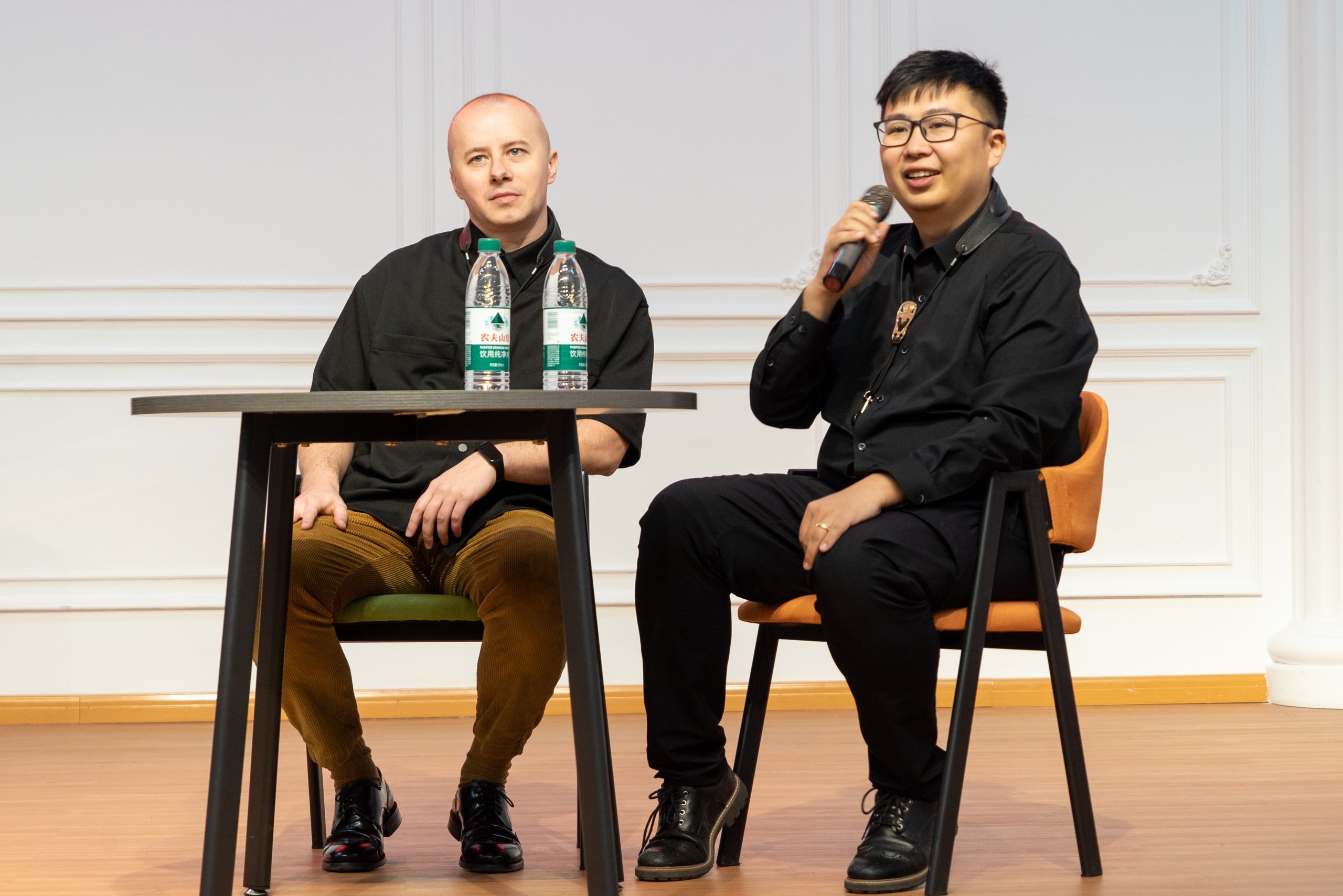 2025年4月2日,作为我院与贵阳学院音乐学院联合举办的"美育创新实践"系列学术活动第三场,"跨文化音乐与教育的对话"主题沙龙在校史馆展演厅举行。白俄罗斯爵士音乐大师罗曼·希马涅茨先生与我院音乐舞蹈教研室副教授邱忠治老师、贵阳知名音乐人阿D老师同台交流,吸引了校内百余名师生,及来自政府部门、企事业单位的音乐爱好者共赴艺术之约。