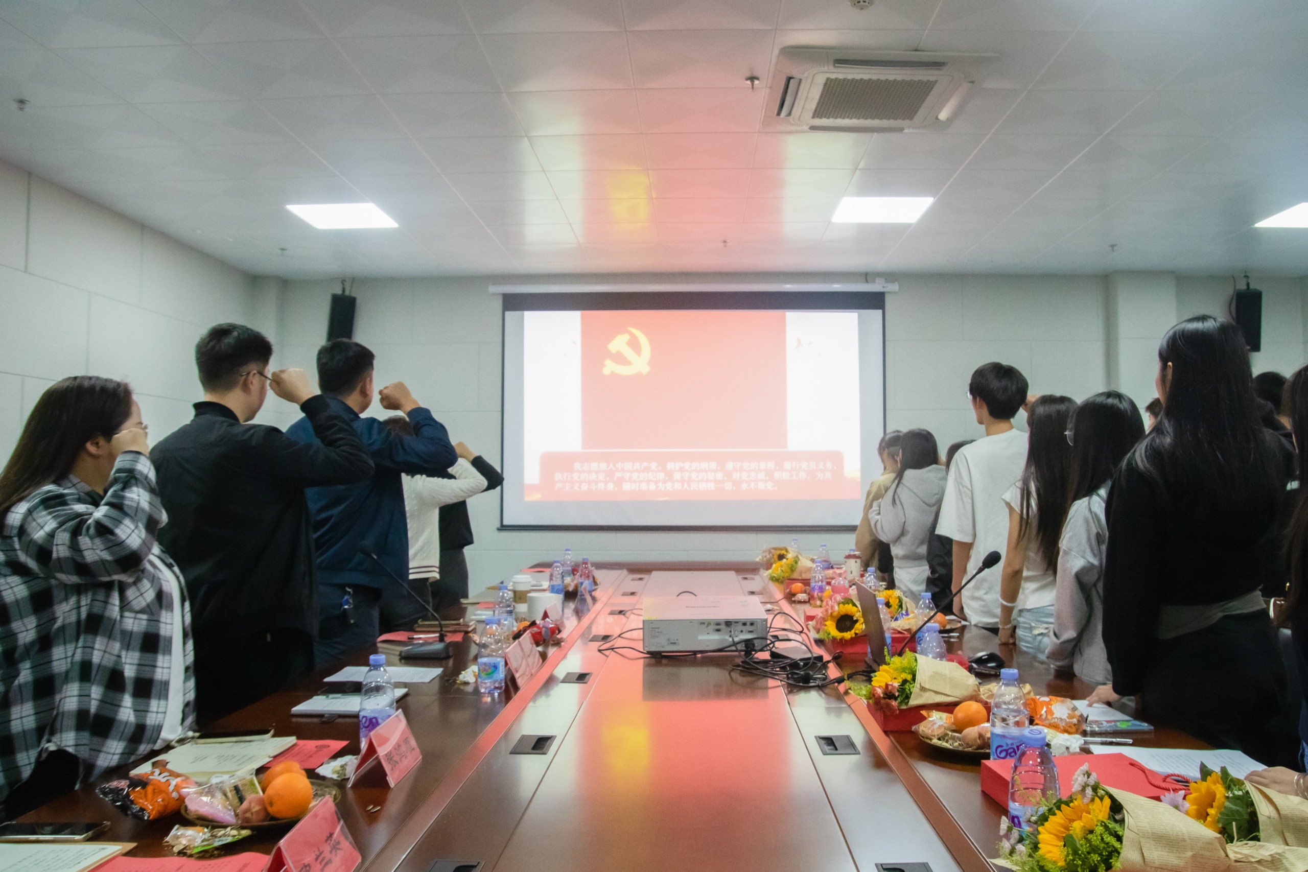 在特色仪式环节,全体党员面向党旗,由学院党委书记张健领誓,重温了入党誓词。铿锵有力的誓言回荡在会场,激励着每一位党员不忘初心、牢记使命。随后,学院领导为毕业生党员赠送了定制纪念品,寄托了对他们未来的美好祝愿和殷切期望。