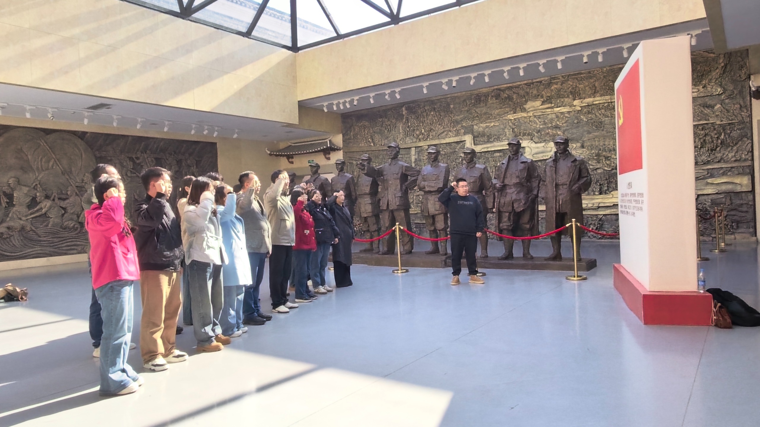 在黎平会议会址,党员教师们在解说员引导下,参观了会议旧址、历史陈列馆,泛黄的文献、复原的场景再现了红军长征途中的关键转折时刻。全体教师列队肃立,齐声朗诵《七律·长征》,铿锵诗句回荡庭院;面对鲜红党旗,全体教职工党员重温入党誓词,铮铮誓言坚定初心使命,深刻感悟到“实事求是、敢于纠错”的革命精神。