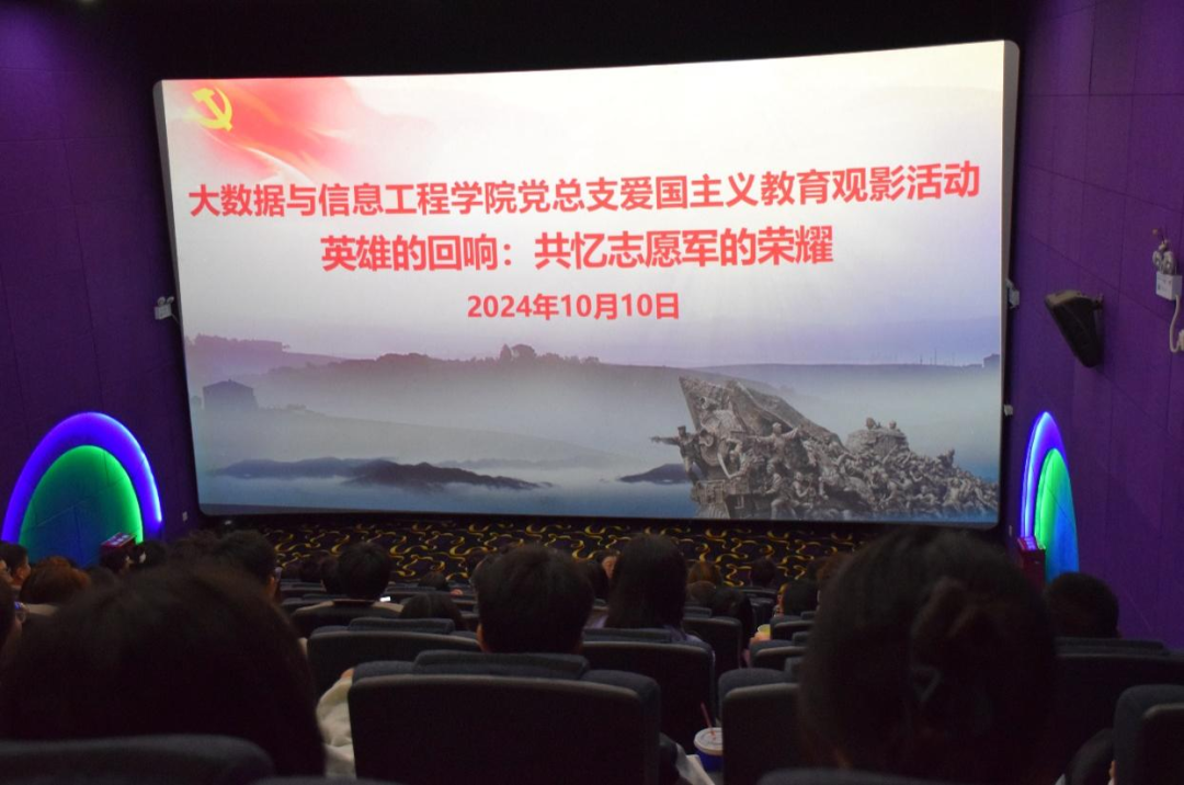 2024年10月10日,大数据与信息工程学院党总支开展爱国主义教育观影活动,组织学院师生共计120余人集体观看爱国主义题材影片《志愿军:存亡之战》。通过集体观影活动,进一步促进了各基层党组织之间的交流与学习,为在场的所有人“沉浸式”上了一堂生动的爱国主义教育课,激励大家在新时代、新征程中汲取奋进力量、赓续红色血脉、传承红色基因,为中国式现代化发展贡献出自己的青春力量。